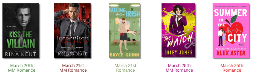 March 20: Kiss the Villain by Rina Kent - “Deep inside, I have the urge to set the world on fire. I keep these impulses in check, rarely indulging in mayhem. Until one night of debauchery backfires, and I'm caught by a villain. Until that night walks into my classroom in the form of my new professor.”