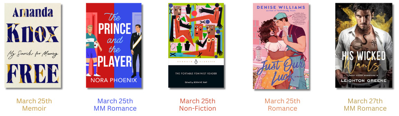March 25: Just Our Luck by Denise Williams - “In an effort to keep the store afloat and to get Sybil’s family off of her back, they agree to fake a relationship for three months. Even with hundreds of millions of dollars, finding each other might end up being the sweetest bit of luck for both of them.”