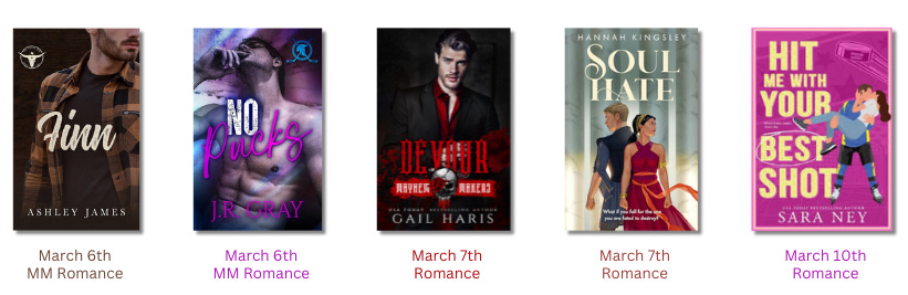 March 6: Finn (The Moore Men #1) by Ashley James - “Falling for my girlfriend’s twin brother wasn’t what I had in mind when I hired him to be my son’s nanny.”