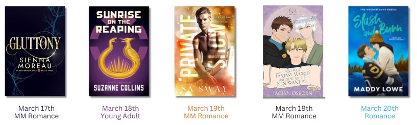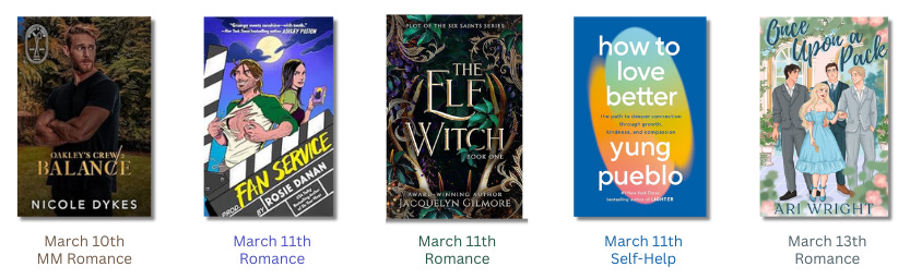 March 11: The Elf Witch (The Plot of the Six Saints #1) by Jacquelyn Gilmore - “It follows a formerly magicless elf as she suddenly comes into powers that her kingdom has never seen and the duplicitous prince she must bargain with to save them at whatever cost—even her soul.”