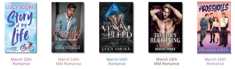 March 14: The Venom We Bleed (Scorpion Kings #1) by Lucy Smoke - “If the Scorpion Kings want to damage the new outcast of Silverwood, they’ll soon learn that anyone can be a killer if you give them the right incentive.”